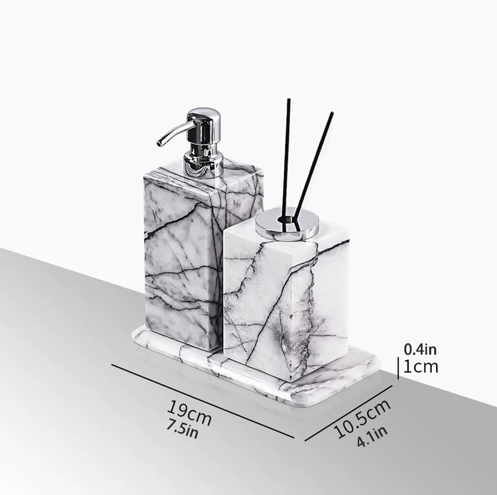SpecificationsProduct Name: Lotion Pump/Soap DispenserProduct Material: MarbleTablet base size: 19*10.5*1cm/7.5*4.1*0.4inLotion bottle size: 7*7*13.5cm/2.8*2.8*5.3inDiffuser bottle size: 7*7*11cm/2.8*2.8*4.3inProduct color: As shownCraftsmanship: Hand cutting/polishingPackage includes: 1 * Lotion dispenser, 1 * Tablet base, 1 * Diffuser bottleWe are committed to providing high-quality service. If you have any questions, please feel free to contact us and we will reply within 24 hours.